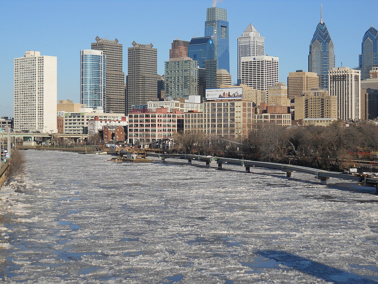 | De Schuylkill-rivier in Philadelphia, bevroren door vriestemperaturen tijdens de polaire vortex-invasie in 2014. |