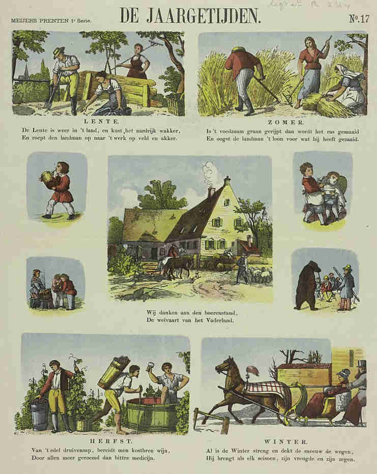 De jaargetijden op een centsprent rond 1800: lente (spitten en planten), zomer (maaien), herfst (druiven oogsten)