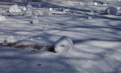 de grotere cilindrisch. Dat de natuurlijke sneeuwballen werkelijk rollend ontstaan blijkt uit het spoor dat ze in de sneeuw achterlaten en dat soms