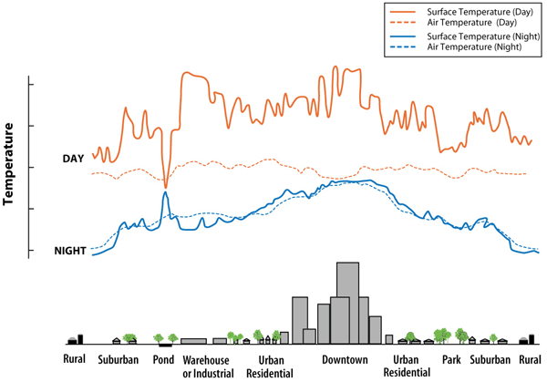 worden de lucht- (gestippeld) en oppervlaktetemperaturen (getrokken krommen) in en rond de stad met elkaar vergeleken voor de dagperiode (rood, boven) en de nachtperiode (blauw, onder). De bovenste, rode, gestippelde kromme laat zien dat het stadseffect in de luchttemperatuur overdag niet zo duidelijk terug te vinden is; 's nachts is het echter overtuigend aanwezig. In de oppervlaktetemperaturen