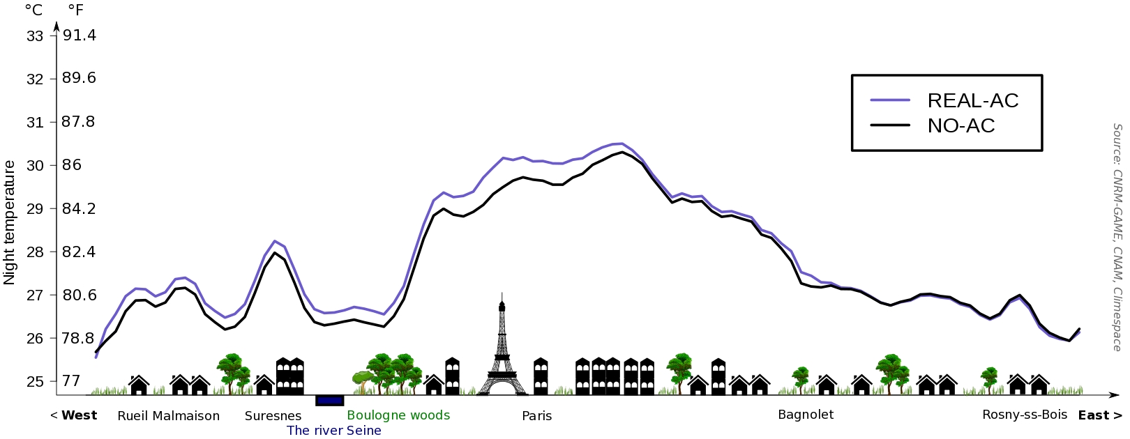 2c. Volgens computerberekeningen van Météo France liggen de temperaturen tijdens een hittegolf door het gebruik van airconditioning hoger