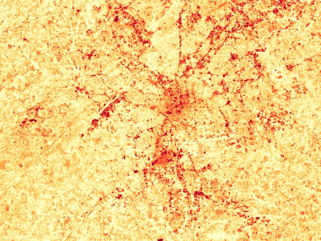 9c: Vergelijk het temperatuurpatroon met de landgebruikkaart (rechts), die eveneens is gebaseerd op Landsat-data. Hoe donkerder