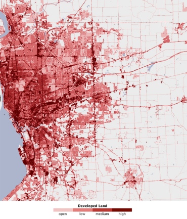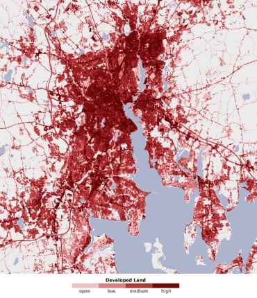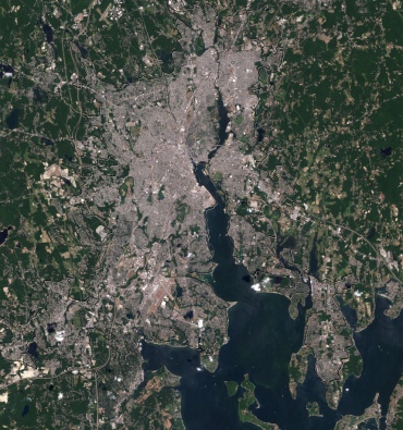 De locatie is in dit geval de Amerikaanse stad Baltimore, MD. Het landgebruik in en rond Baltimore wordt getoond in figuur 7b. Gebieden met veel beton, asfalt en cement zijn rood, terwijl in de lichtgrijze gebieden vegetatie overheerst. Ook hier leidt meer groen tot aangenamer temperaturen. |