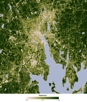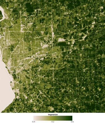 Landsat-data. In de beige getinte gebieden is vrijwel geen begroeiing; groen duidt op een rijke plantengroei. In gebieden met vegetatie is