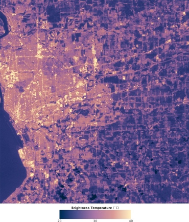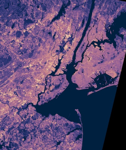 6. Infraroodbeeld van New York, N.Y. op een hete augustusdag (muis naast beeld). Blauw is warm en geel heet. Datum: 14 augustus 2002.