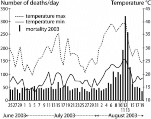2b. Het aantal sterfgevallen is vooral hoog bij hoge minimumtemperaturen. De grafiek toont het aantal sterfgevallen in Parijs tijdens de hittegolf