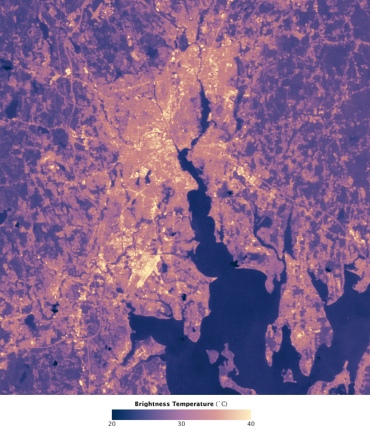 Providence, R.I., op een hete julidag (muis naast beeld). Blauw is warm en geel heet. |