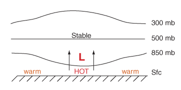 | Op het land veroorzaakt intense, snelle opwarming van het aardoppervlak door de zon de opwarming van de onderste lagen van de atmosfeer, via opnieuw uitgestraalde energie in het infraroodspectrum. De hetere lucht is minder dicht dan de omringende koelere lucht en stijgt, |