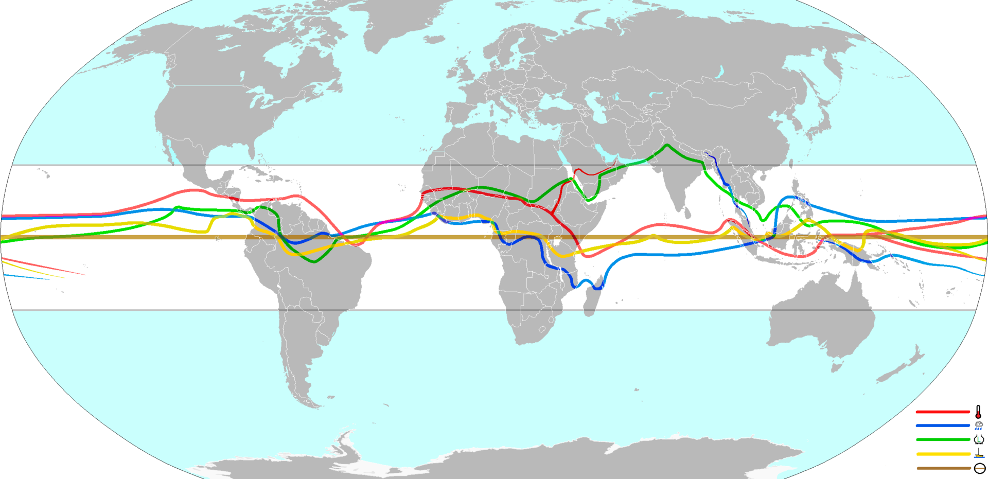 | 3: De pluviale evenaar is blauw weergegeven, wat de continue gemiddelde jaarlijkse maximale neerslag van de tropische regengordel weergeeft. |