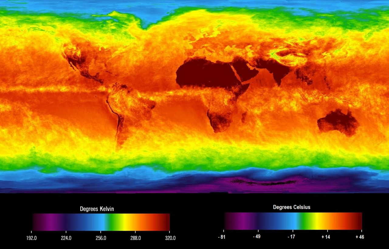 1: Infraroodsatellietfoto, waar de equatoriale gordel van wolken en regen te zien is, die wordt geassocieerd met de hoge en koude wolken van