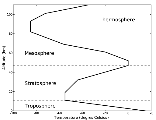 | Hoe hoger in de atmosfeer, hoe minder van die straling doordringt en geabsorbeerd kan worden en dus hoe kouder. De verticale temperatuurgradiënt in de troposfeer neemt gemiddeld 6,5 °C per km af. Er komen echter tropopauzebreuken voor met een ander temperatuurverloop. Dit is het geval bij de straalstromen. In de tropopauze stijgt of daalt de temperatuur nauwelijks. Dit is de scheidslijn met de stratosfeer. Hier neemt de temperatuur toe met de hoogte. |