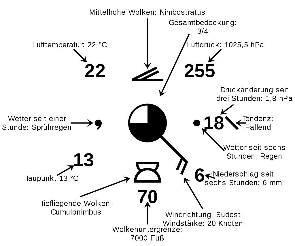 | Deze gegevens worden vastgelegd (puntgericht) op een geografische kaart volgens het aanwijsmodel in de figuur rechts1. Elk stukje informatie heeft een positie en een representatie die rond het centrale punt is gedefinieerd. Zo kan de meteoroloog in één oogopslag de informatie zien die hem interesseert. Dit richten moet weinig ruimte in beslag nemen om het aantal stations dat zichtbaar is op de kaart, zonder overlap, te maximaliseren in een regio met een hoge dichtheid aan stations. |