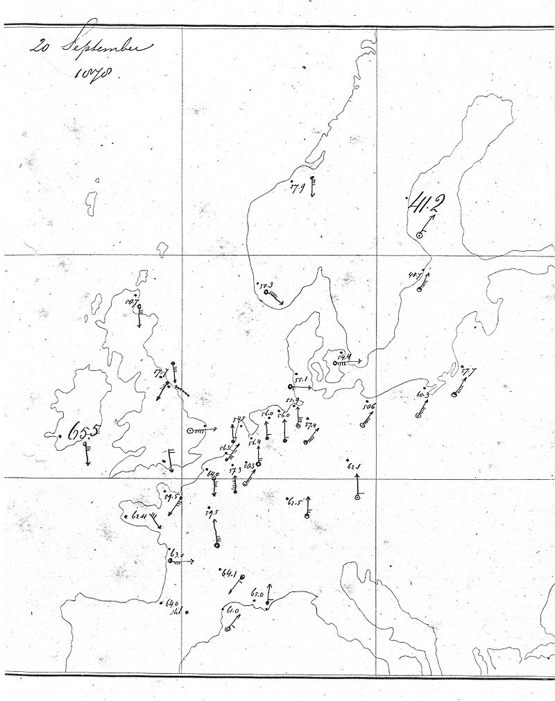 | 2: Een van de eerste weerkaarten van 20 september 1878, waarschijnlijk door Buys Ballot. |