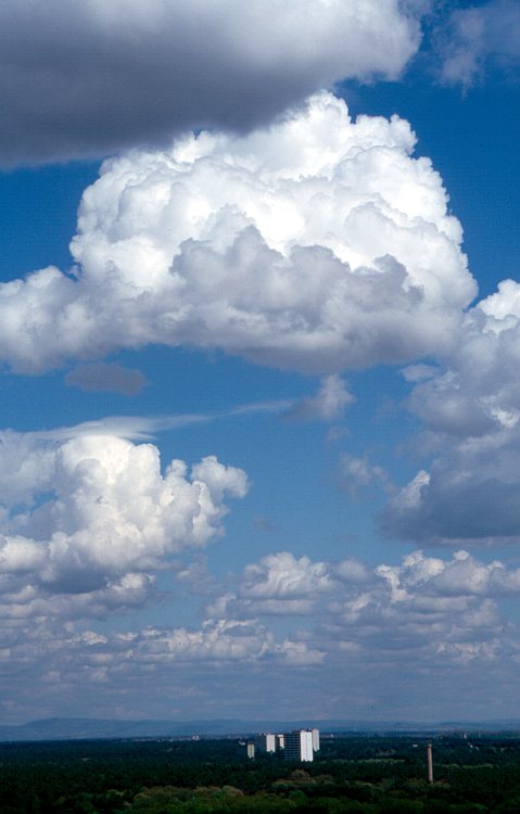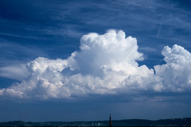 Cumulonimbus calvus pileus, Cumulus congestus (Cb cal pil, Cu con) Locatie: Karlsruhe (Baden-Württemberg, Duitsland) - Copyright: Bernhard Mühr |